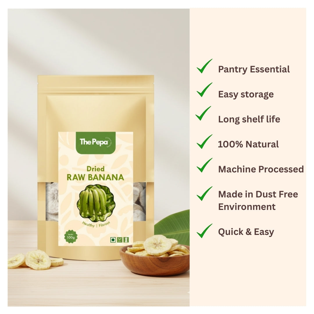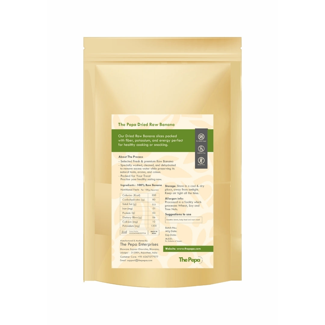 Machine-dried raw banana, naturally high in fibre, resistant starch, Vitamin B6, and potassium. Perfect for baby porridge, smoothies, pancakes, and multigrain recipes. Gluten-free, vegetarian, and free from additives, preservatives, or added sugar.