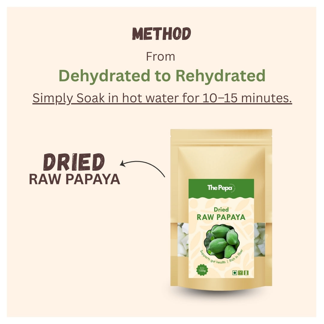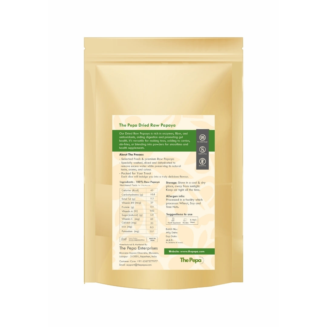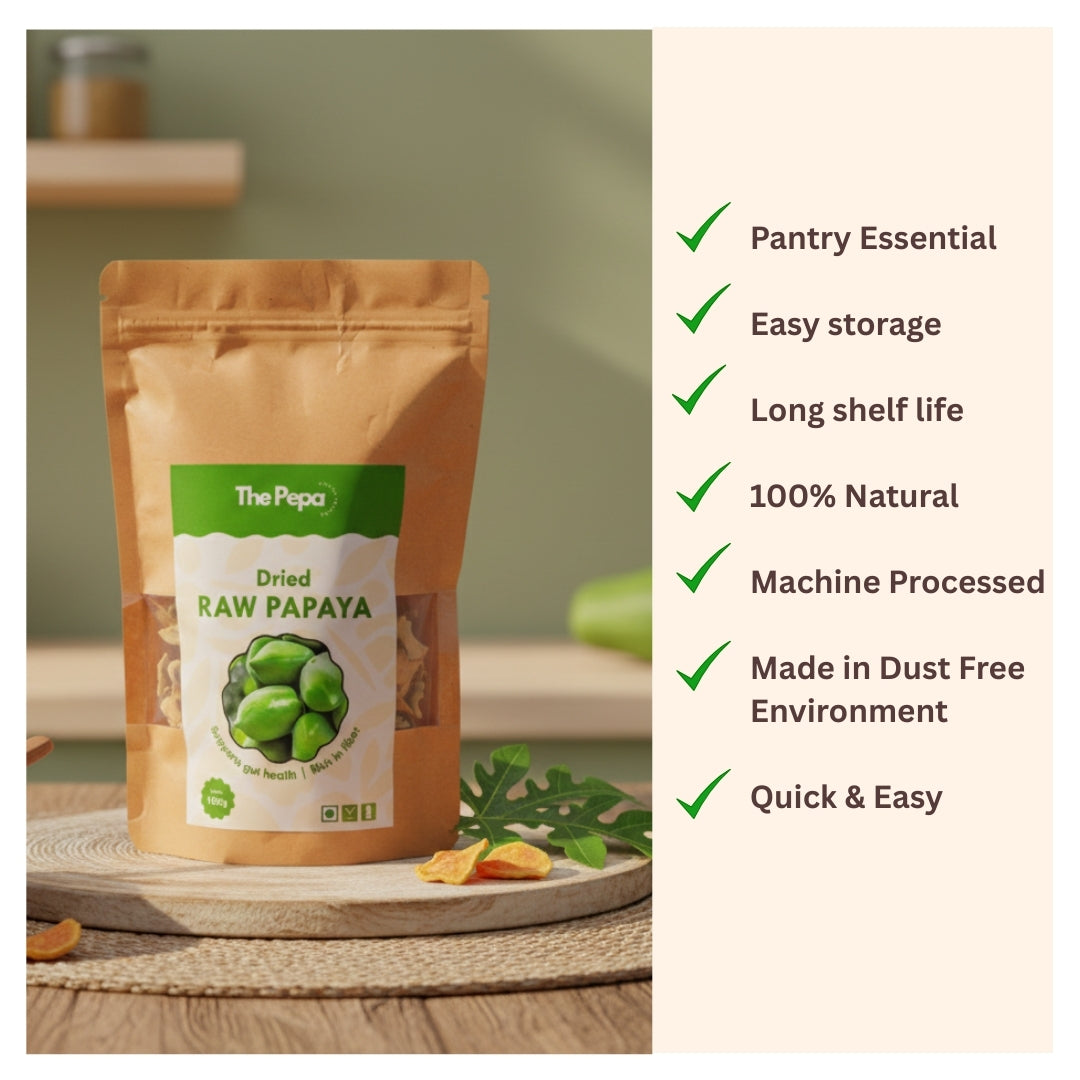 Machine-dried raw papaya cubes, rich in papain enzyme and fibre. Supports digestion, gut health, and internal cleansing. Ideal for salads, juices, parathas, curries, and sabzis. Vegetarian, natural, and preservative-free.